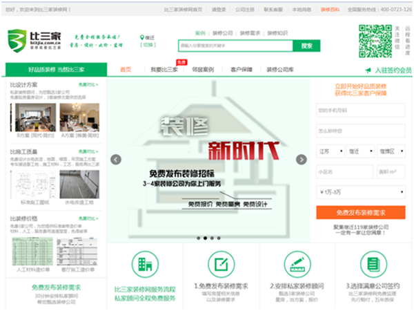 比三家裝修網于2015年10月份落戶蘇宿電子商務產業(yè)園,該裝修網定位于“互聯網+”大眾創(chuàng)業(yè)平臺,是一家扎根于三線城市,以“中介生意”模式幫助傳統的裝修行業(yè)的公司利用互聯網接到更多的訂單,幫助用戶找到合適的裝修公司。網站通過好品質裝修,比設計方案、比施工質量、比裝修價格,為用戶提供符合比三家裝修網標準的服務。