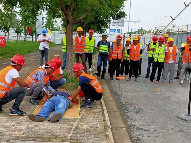此次演練是模擬工人在戶外作業(yè)時發(fā)生中暑后的現(xiàn)象以及如何進行急救的。演練現(xiàn)場,演練示范人員按照應(yīng)急預(yù)案對“中暑”的員工進行緊急施救,首先發(fā)現(xiàn)中暑人員后將其迅速轉(zhuǎn)移到陰涼通風(fēng)的地方,移動、冷敷、擦浴、降溫、補水......各項救援措施緊張有序。整個演練過程歷時30多分鐘,中暑人員在急救小組的緊密合作下,及時得到救治。演練過程中,市政工程部全體人員和各在建工地相關(guān)人員全程參與觀摩。
