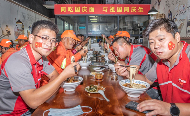一碗“國慶面”,一份愛國情。當(dāng)一碗碗熱氣騰騰、香氣撲鼻的面條送到環(huán)衛(wèi)工人、快遞小哥等堅(jiān)守在一線崗位上的工作人員手中,大家接過面條,享用著寓意美好的“國慶面”,每個(gè)人的臉上都洋溢著幸福和快樂的笑容。大家用最樸素最平常的食物,表達(dá)了對祖國母親生日快樂的真摯情感。