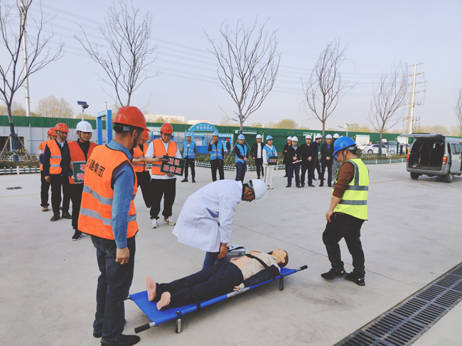 本次演練共分6個小組,分別為:現(xiàn)場模擬組、現(xiàn)場警戒(搶修)組、應(yīng)急救援(疏散)組、通訊聯(lián)絡(luò)組、事故調(diào)查組、 觀摩組。假設(shè)工人在生活區(qū)違規(guī)使用大功率電器突發(fā)火災(zāi),被煙霧和火勢圍困,二樓有人發(fā)出救援信號,正在附近巡查的安全員發(fā)現(xiàn)情況后,立即趕赴現(xiàn)場并打電話給項目生產(chǎn)負(fù)責(zé)人,在接到通知后,項目生產(chǎn)負(fù)責(zé)人迅速安排項目部應(yīng)急救援辦公室負(fù)責(zé)人,并啟動應(yīng)急預(yù)案,各救援小組立即到達(dá)現(xiàn)場開展工作,安全員迅速引導(dǎo)全體人員有序從疏散樓梯疏散到安全位置,救援組帶著擔(dān)架、急救箱等趕赴現(xiàn)場,將“受傷”人員用擔(dān)架從房內(nèi)撤離到安全位置,同時救援醫(yī)生對“受傷”人員進(jìn)行簡單的心肺復(fù)蘇、人工呼吸,并迅速送往醫(yī)院進(jìn)行治療。