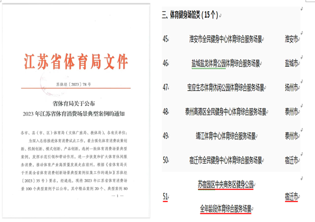 近日,江蘇省體育局印發(fā)《關于公布2023年江蘇省體育消費場景典型案例的通知》,遴選公布100個體育消費場景典型案例,其中精品案例20個、典型案例80個。蘇宿園區(qū)中央商務區(qū)健身公園全年齡段體育綜合服務場景入選2023年江蘇省體育消費場景典型案例。