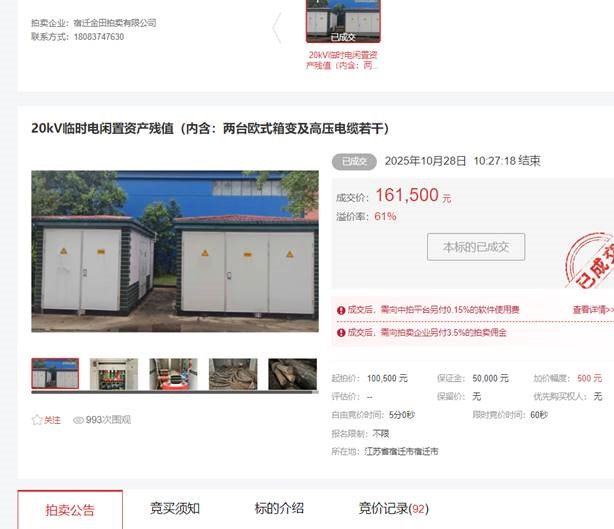 近日,城發(fā)公司青年公寓臨時電項(xiàng)目一批閑置資產(chǎn)在中拍平臺公開拍賣,經(jīng)過27分鐘的緊張激烈競價,最終以161500元成交標(biāo)的,比評估價100500元高出61000元,溢價率61%。