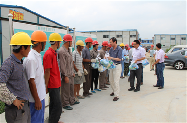 8月11日上午,園區(qū)黨工委委員、規(guī)劃建設(shè)局局長周原帶隊來到夢家園、許莊變、2014年市政二標等項目工地,檢查防暑降溫措施落實情況,并慰問奮戰(zhàn)在高溫一線的建筑工人。